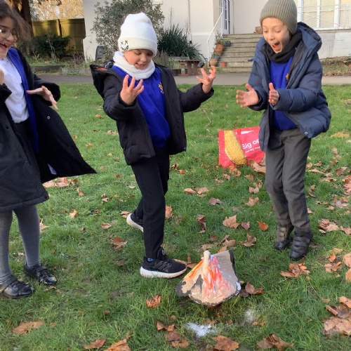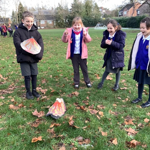 After that, we took them outside to erupt. We added vinegar to our bottles first, then use bicarbonate of soda to create a chemical reaction, which looked like a volcano exploding out of our bottles! It was so much fun!