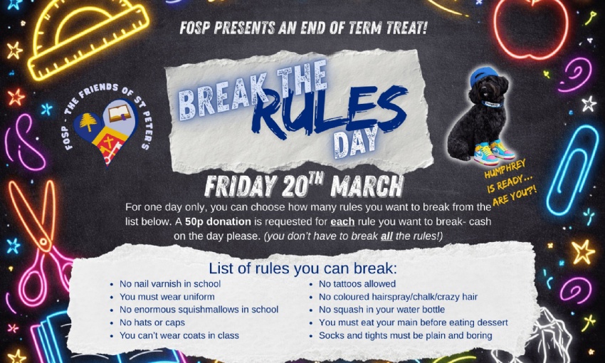 Join us in helping to raise funds for FOSP and the school by choosing your favourite 'rule' to bend. Do you want to share a table with your biggest squishmallow? Does having a sneaky slurp of squash appeal to you? Or is your greatest dream to wear your coat in class? (genuinely- this is a Year 6 fave!)