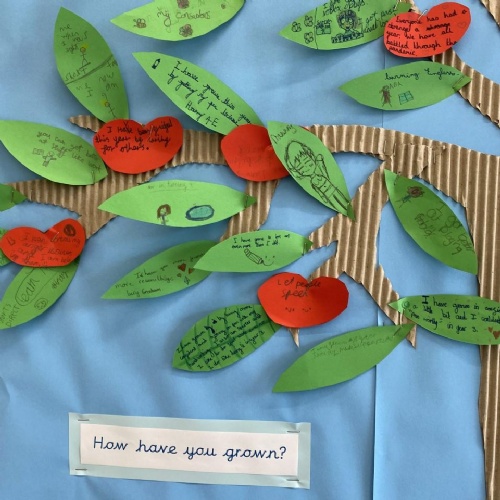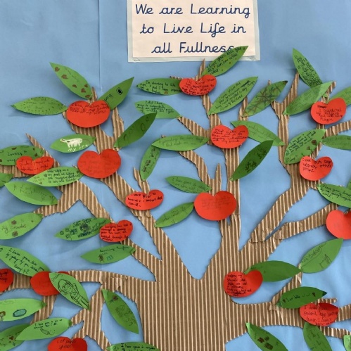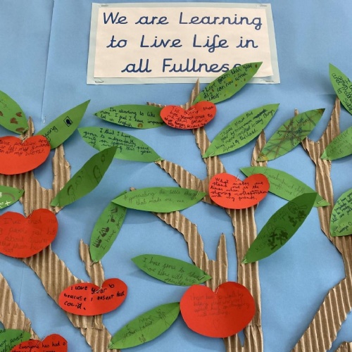 RE is a driving subject within our curriculum – a best practice model for real life learning and spiritual reflection in response to our vision of ‘Life in all its Fullness’ for all members of our local and global community. At the end of each RE unit, children have time to consider how they might assimilate their leaning – reflecting on how they might live their lives differently in response to their learning and our vision of ‘Life in all Fullness’. These reflections feature in children’s Learning Journals and are celebrated as part of our ‘Life in all Fullness’ tree display.
