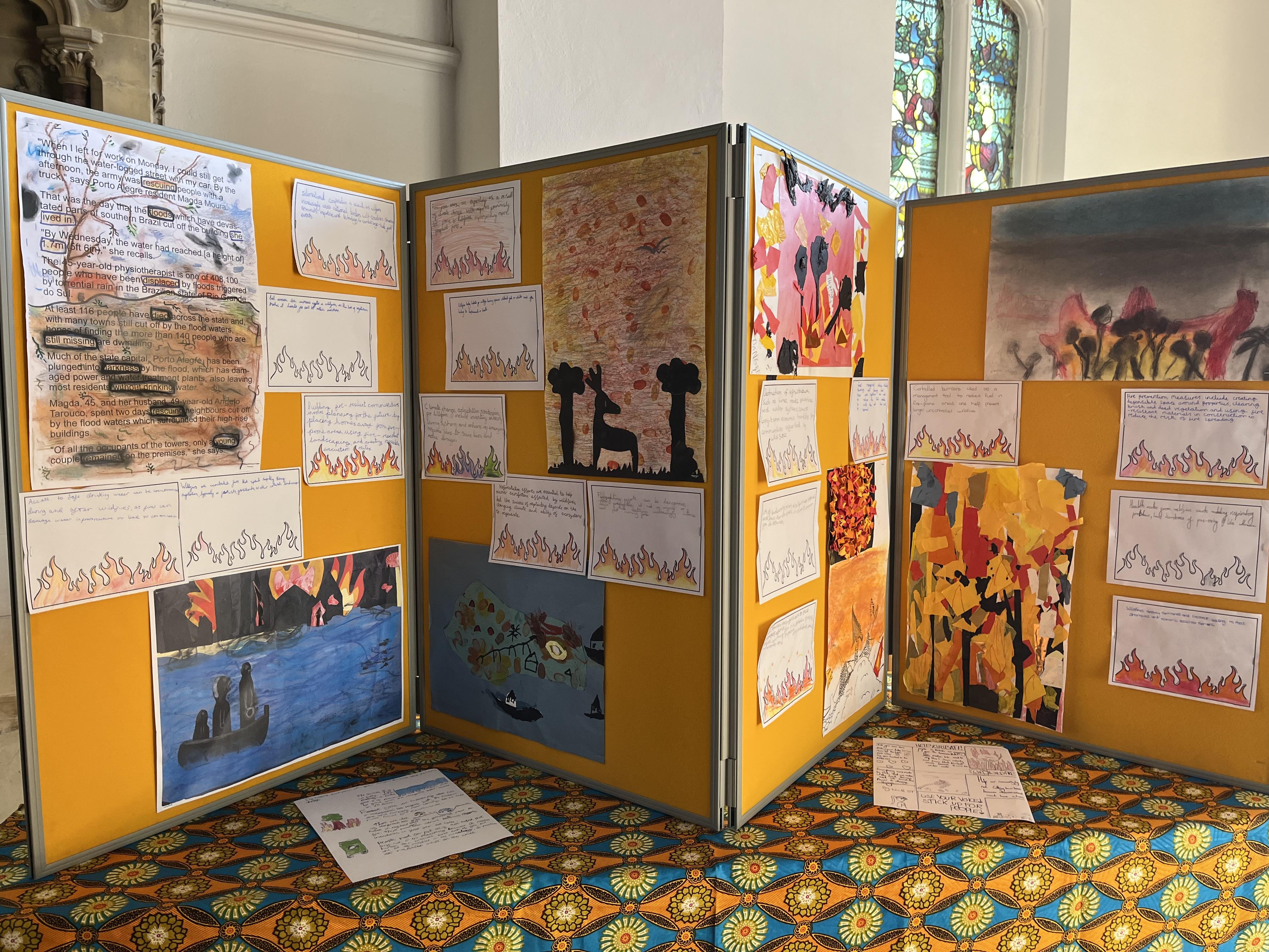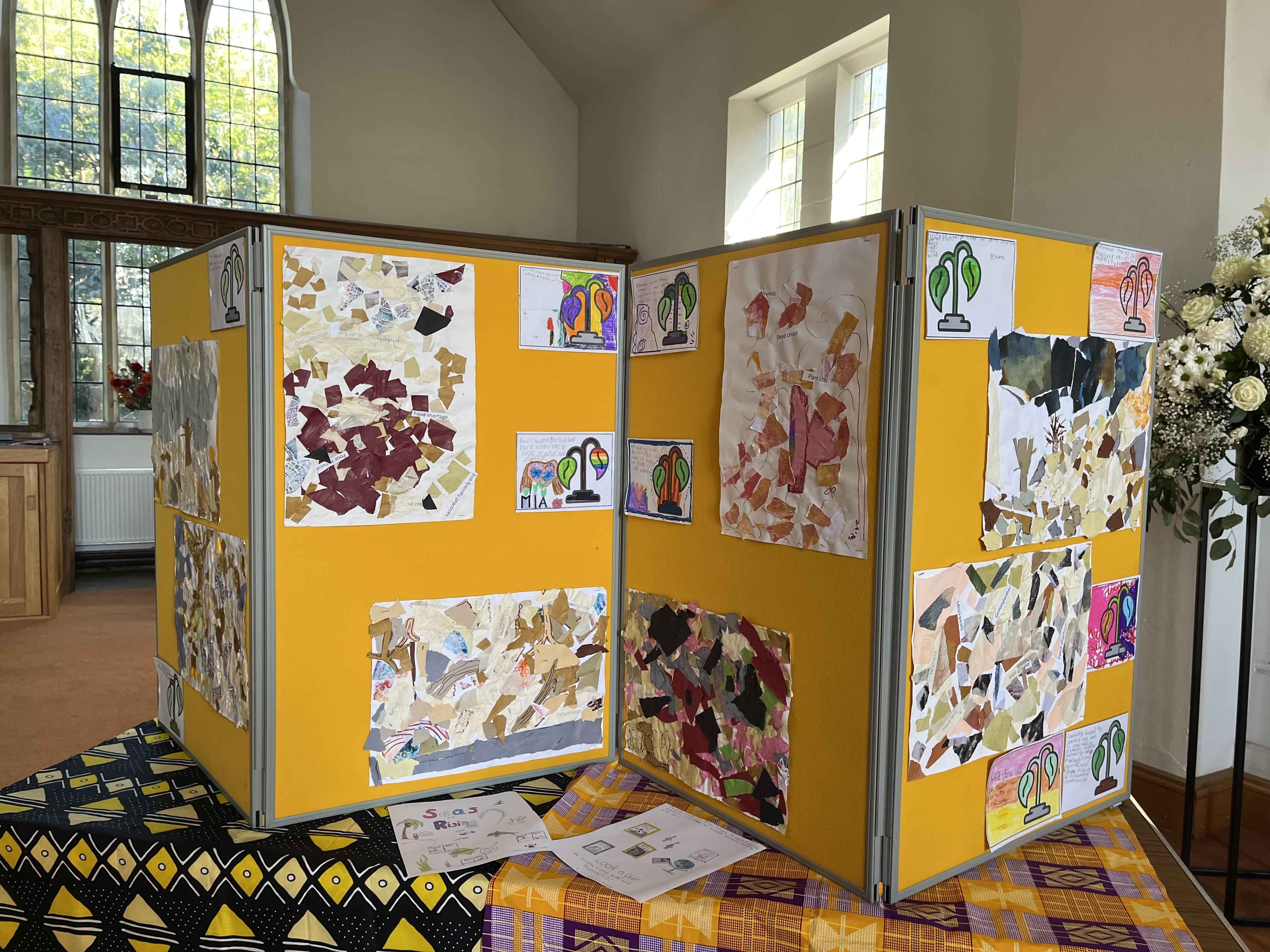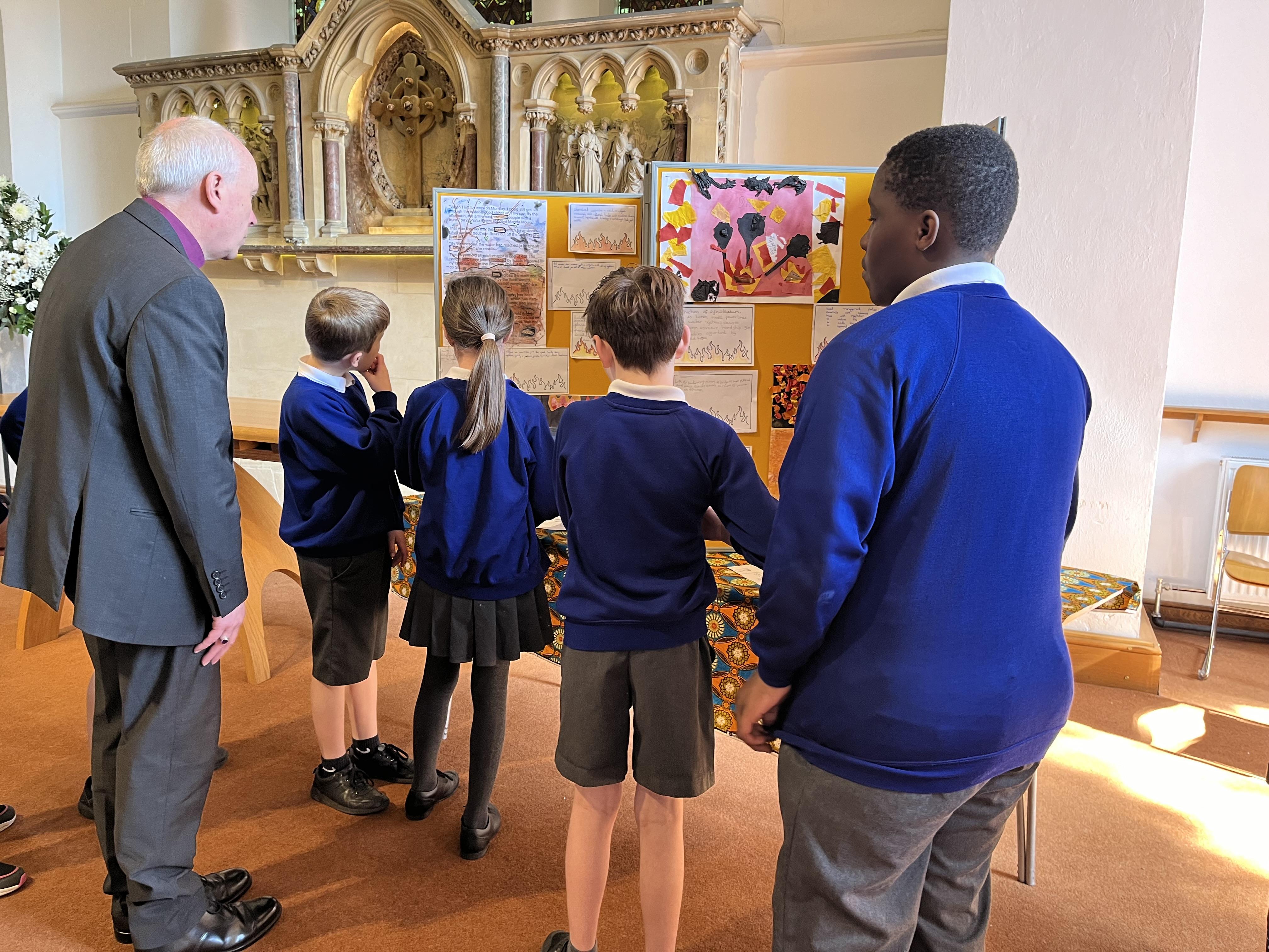 Our Global Ambassadors led the Bishop of Dorking on a tour of our ‘Creative for Climate’ Art Exhibition, sharing their passion for climate justice and their desire to make a difference. Each year group responded to an area of climate justice through an art outcome.